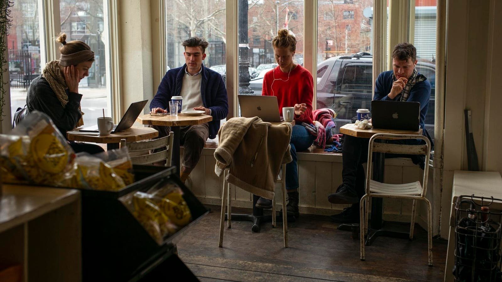 BROOKLYN, NEW YORK – JANUARY 28: Patrons at the Littleneck Outpost restaurant use their laptop … [+]
