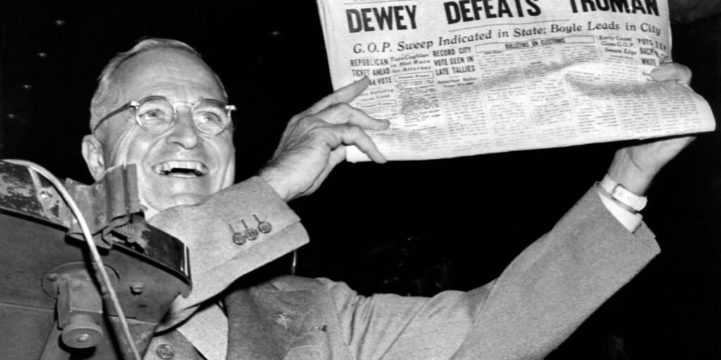 Close, chaotic, and contested elections have long been a recurring part of American politics. I’ve always been drawn to that 1948 photo of Harry Truman, Cheshire Cat grin, holding up the Chicago Daily Tribune and its screaming front page: “Dewey Defeats Truman.” (Spoiler alert—he did not.)