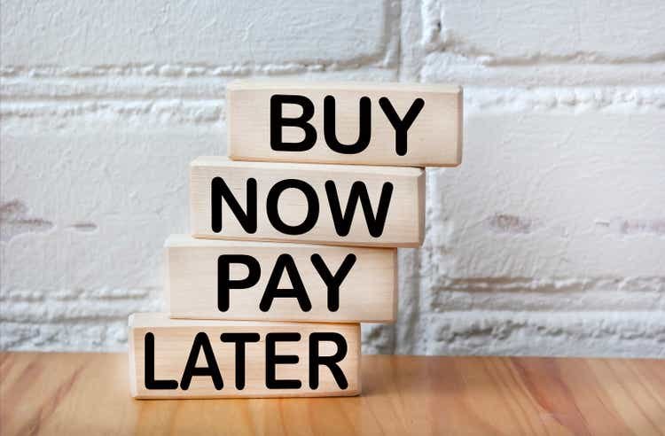 Against the background of a white brick wall, wooden blocks with the text BUY NOW, PAY LATER.