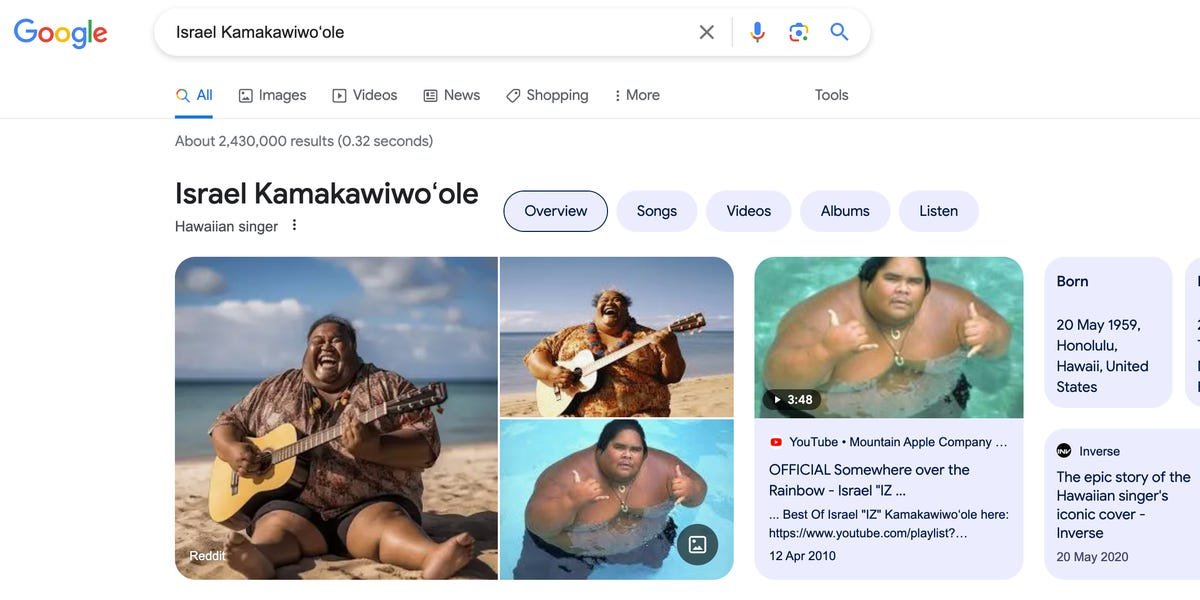 • If you Google “Israel Kamakawiwoʻole” right now, you’ll see AI images in the top spots.