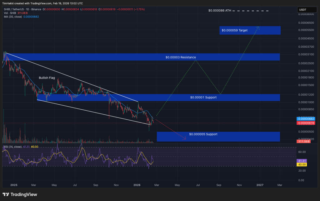 Currently trading around $0.000006187, Alibaba’s analysis suggests that a decisive breakout above resistance in the $0.000025 to $0.00003 range could trigger a strong upside move, potentially lifting SHIB to $0.000059 by year-end.
