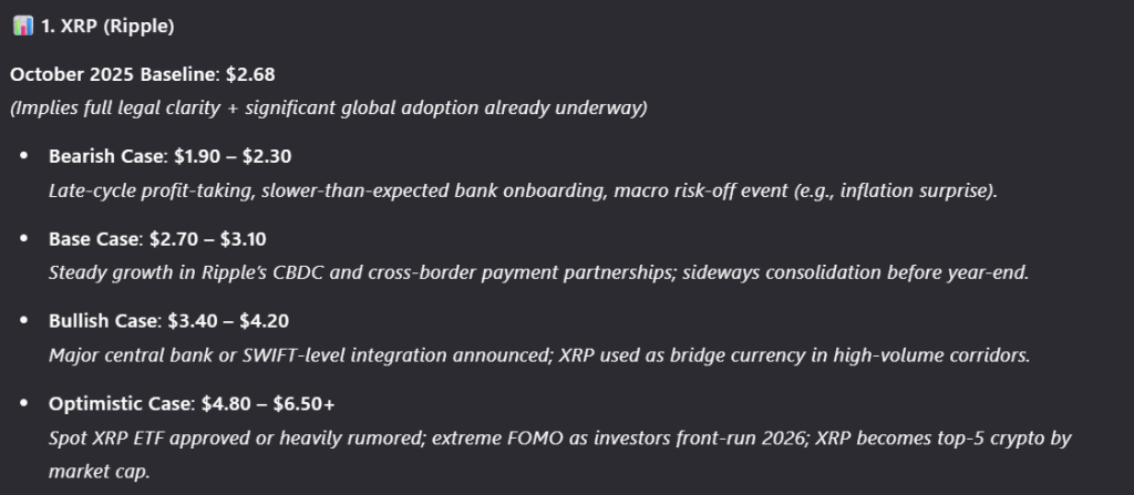 The forecast centers on institutional-grade adoption, positioning XRP as a bridge asset for high-volume payment corridors, potentially tied to central bank or SWIFT-level integrations.
