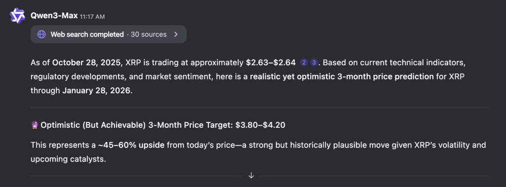 With Qwen AI outperforming in the Alpha Arena trading contest, a lot of traders are suddenly paying attention to its opinions. We asked it for an XRP prediction over the next three months, and let’s just say, its outlook was very bullish.