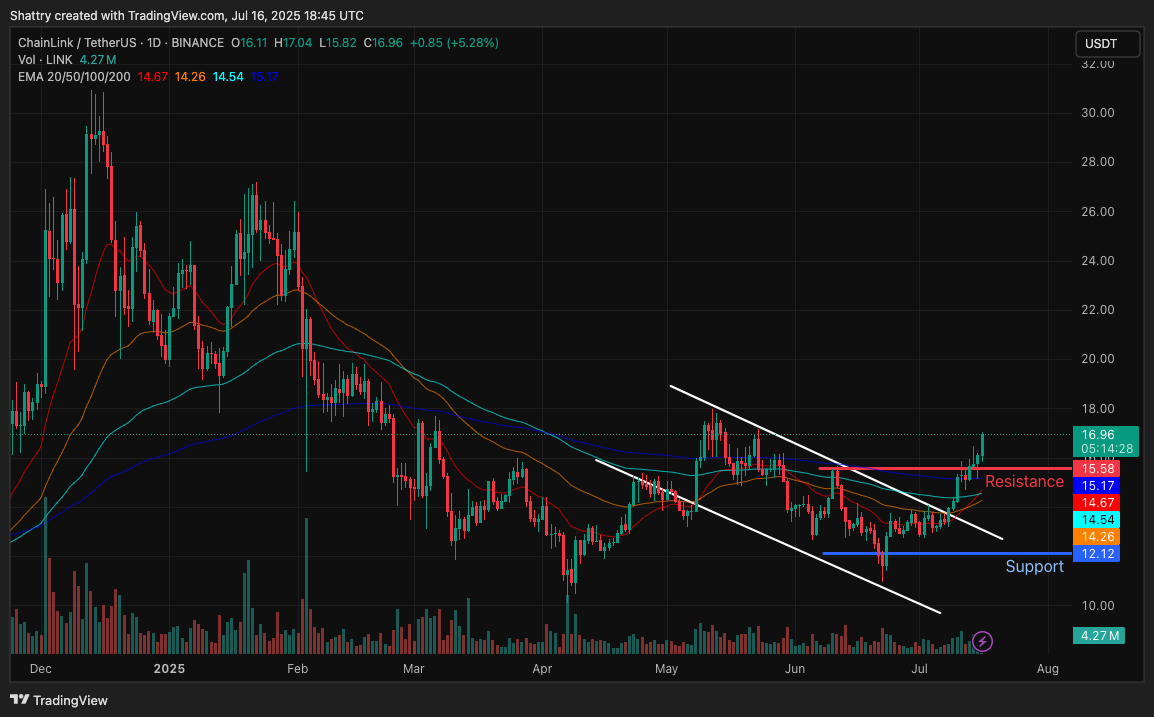 Chainlink’s price action over the past 90 days has formed a textbook falling wedge pattern, one of the most reliable bullish reversal formations in technical analysis.