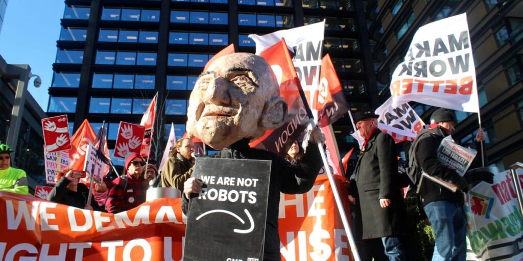 “Amazon is a company that turns Jeff Bezos into the world’s richest man to the point where he can go to space. And yet our members are not only struggling to live, but they’re having to work under horrendous conditions,” Andy Prendergast, GMB’s national secretary, told Business Insider at the London protest.