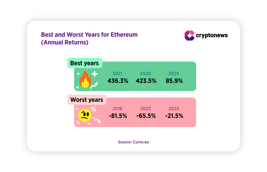 Data from Curvo.eu shows that Ethereum’s last strong performance year was 2023, when ETH gained roughly 86%. The standout year remains 2021, when Ethereum surged by 436%.