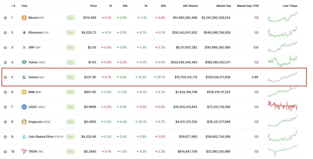 Treasury holdings in Solana are also climbing, according to CoinGecko data. On Sep. 2, U.S.-based Sharps Technology added 2 million SOL to its balance sheet — worth about $476 million at current prices near $238.