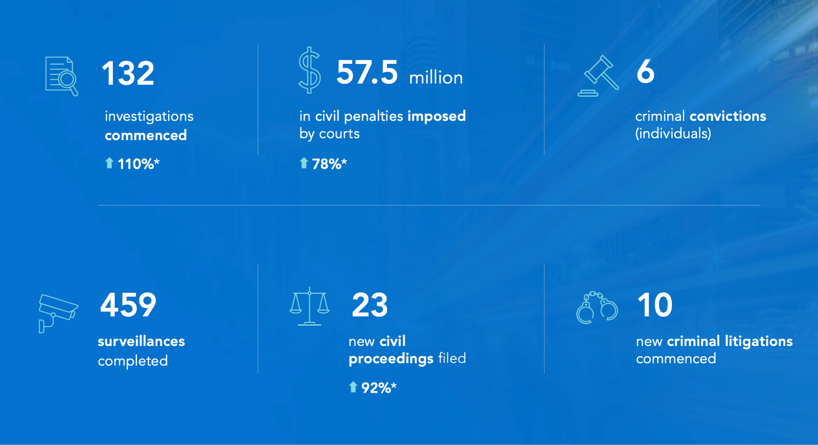 ASIC achieved significant enforcement outcomes during the first half of 2025, including $57.5 million in civil penalties imposed by courts, six criminal convictions, and 345 new investigations commenced.