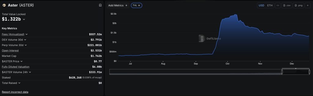 Data from DeFi Llama shows that Aster’s total value locked (TVL) started to drop after the October 10 flash crash. Back then, Aster’s TVL sat at nearly $2.5 billion, while it has now retreated to $1.3 billion.