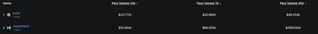 Aster has already become the leading perp DEX by 24-hour volume according to DefiLlama, attracting $25 billion to Hyperliquid’s $10 billion as adoption of the platform grows.