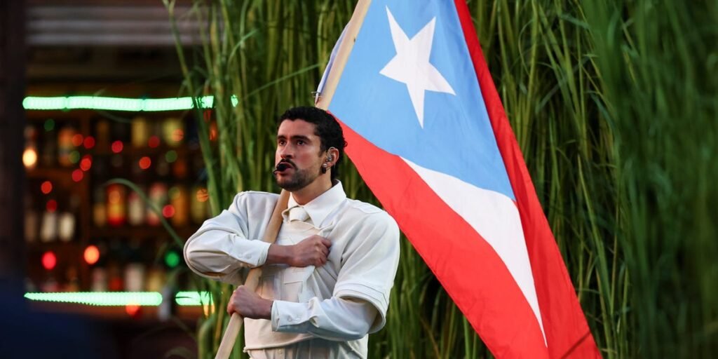 Nods to the Puerto Rican singer’s motherland were peppered throughout the set, which was designed to evoke the US territory’s signature aesthetics, from sugar cane fields to a storefront labeled “La Marqueta” (a slang term for market) and various vendors selling tacos and piraguas (shaved ice). While performing “El Apagón,” a song about the frequent blackouts and infrastructure issues affecting Puerto Ricans, Bad Bunny brought this symbolism to the forefront, waving the Puerto Rican flag.
