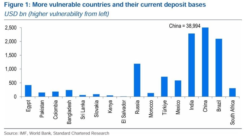 Standard Chartered identified Egypt, Pakistan, Colombia, Bangladesh, and Sri Lanka as the most exposed to a potential deposit flight, with Turkey, India, China, Brazil, South Africa, and Kenya also at risk.