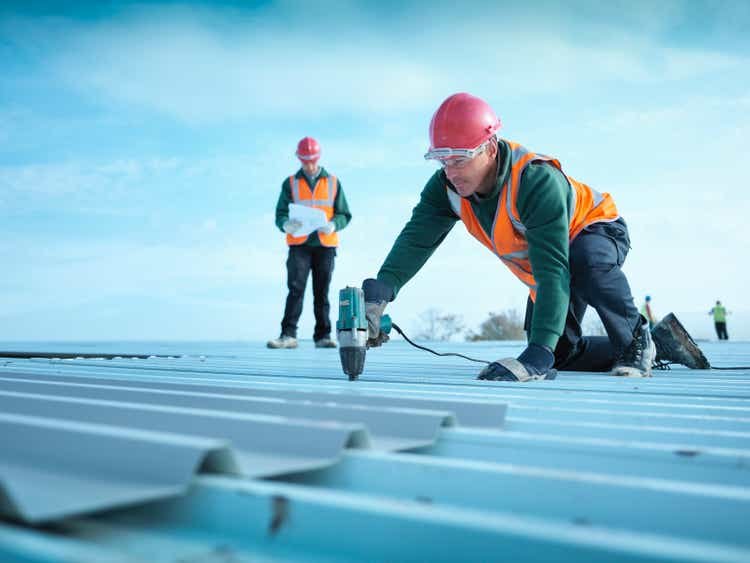 Building foreman reading plans as workman insulates factory roof