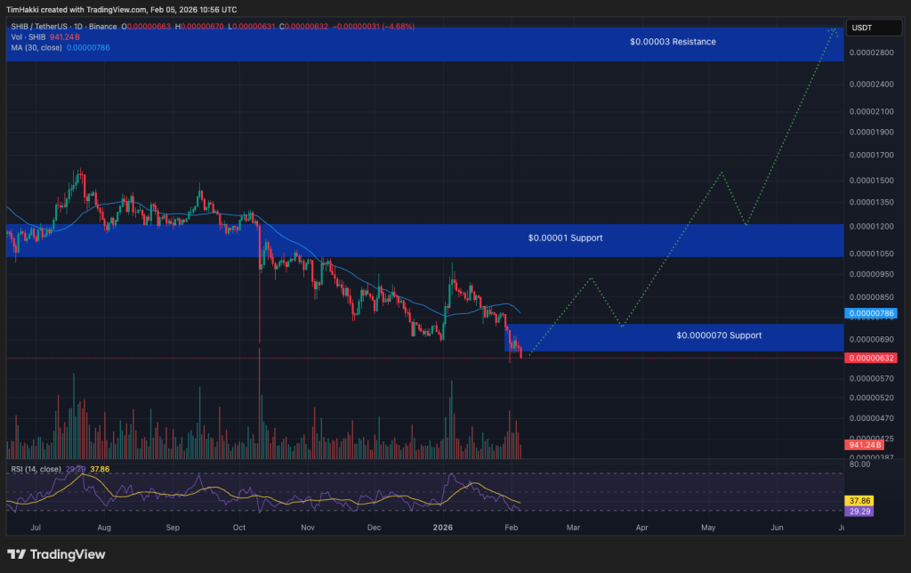 Supported by an expansive community and an expanding ecosystem, SHIB is increasingly regarded as more than a meme coin. The asset currently trades around $0.0000064 and has an oversold relative strength index (RSI) of 29, which indicates the recent selloff is now concluding and SHIB investors will likely be doubling down at these prices over the weekend.