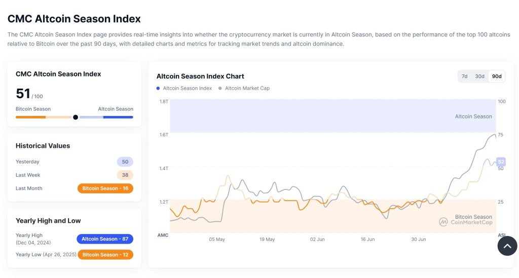 Altcoin Season Index Climbs to 51, Up from 16 Last Month
