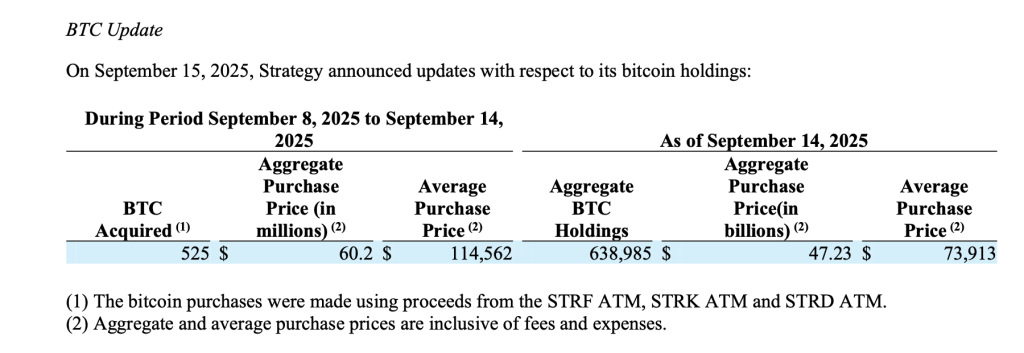 According to a filing on September 15, 2025, the firm acquired an additional 525 BTC during the period of September 8–14, at an aggregate purchase price of $60.2 million.