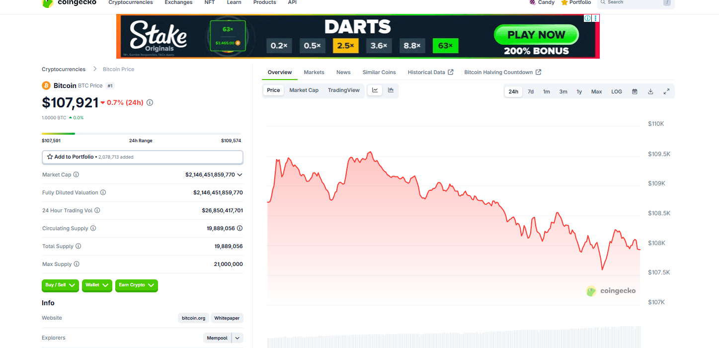 Bitcoin was not spared. After flirting with an all-time high of $111,814 last week, BTC slid 0.74% in the last 24 hours and is now trading at $107,936.08.