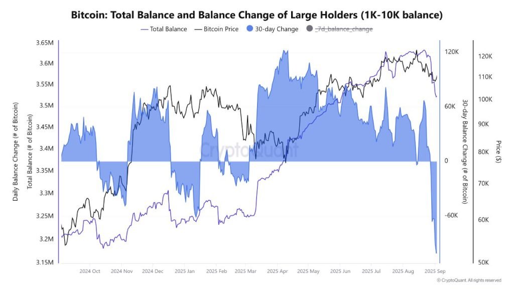 Data from CryptoQuant reveals that in the last 30 days, whale reserves have fallen by more than 100,000 BTC, which often indicates intense risk aversion among large investors.