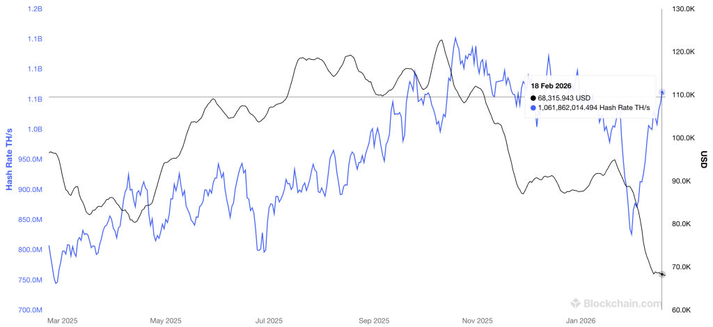 The network hashrate snapped back in a sharp V shaped recovery, even after January wiped out weaker operators. That kind of rebound suggests miners are not backing down. If anything, they look positioned for upside while $60,000 holds.