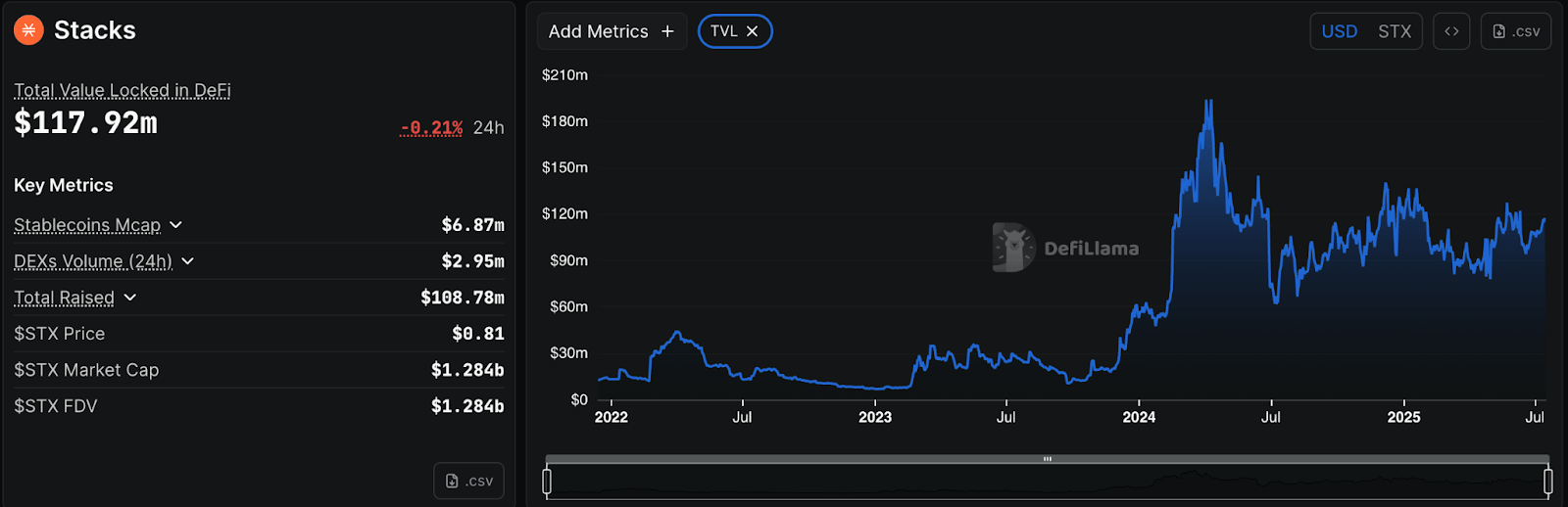 Despite being live for years, Stacks has struggled to attract meaningful on-chain activity. Its total value locked (TVL) sits at around $117 million, which pales in comparison to newer Layer-2s like Base, which has already surpassed $3.9 billion.