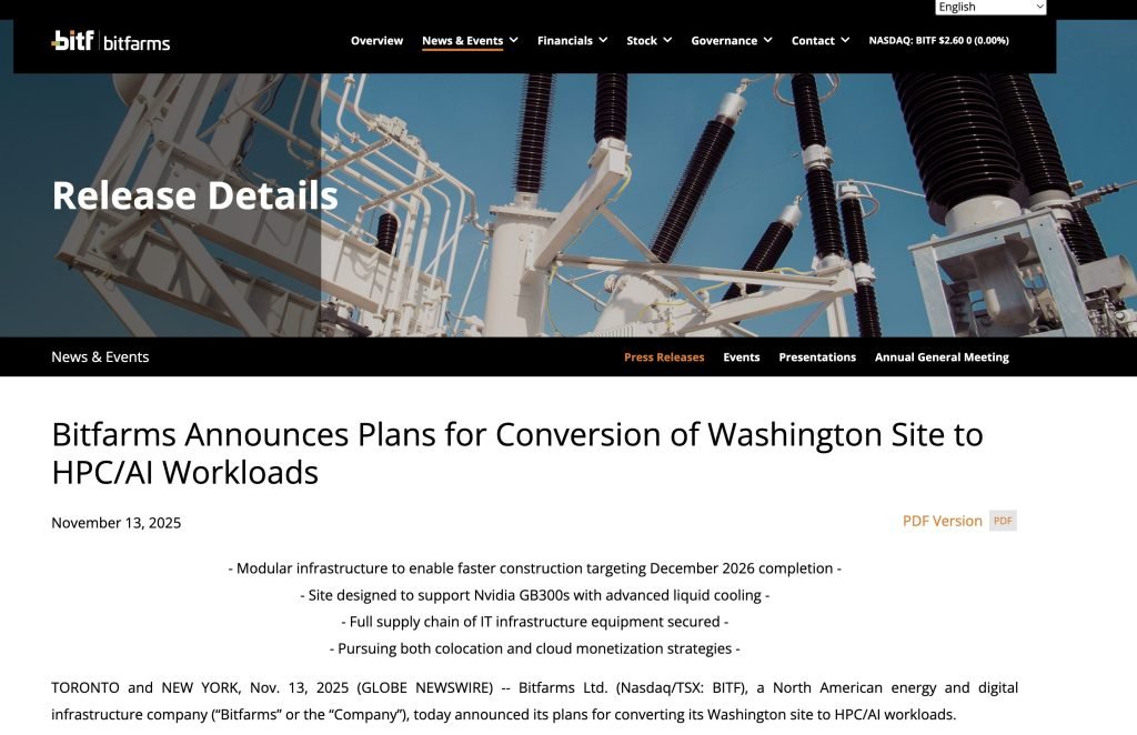 The company detailed its transition plans alongside earnings, revealing that its 18-megawatt facility in Washington State will become the first Bitfarms site fully converted to support HPC and AI workloads.