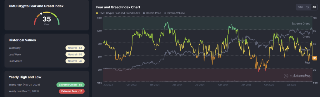 Despite the selloff, technical analysis signals it as a healthy reset rather than the start of a new bearish trend. With the Crypto Fear and Greed Index at 35, market sentiment now mirrors early accumulation phases seen in prior cycles.