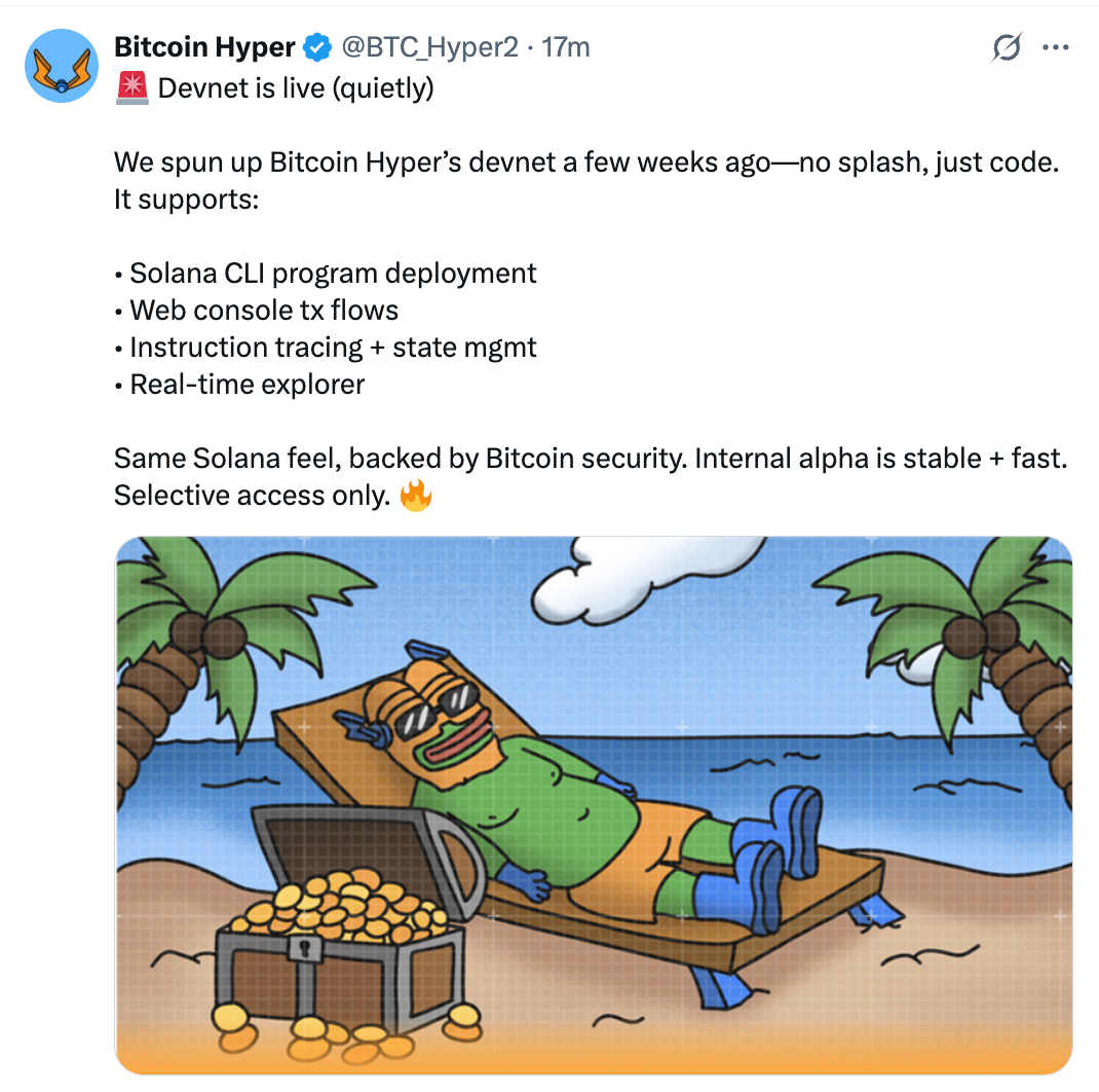 The roadmap progress has encouraged early buyers, Today saw the team announce that it had (quietly) turned on the Bitcoin Hyper devnet a few weeks ago.