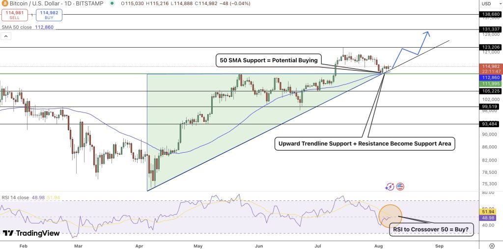 Bitcoin is trading just above $114,000, defending its ascending trendline and 50-day SMA, a key confluence zone that traders often watch for bullish continuation. This technical retest comes as institutional momentum heats up: Satsuma Technology just raised $218 million in BTC-denominated funding, adding to a broader wave of long-term capital moving into Bitcoin.