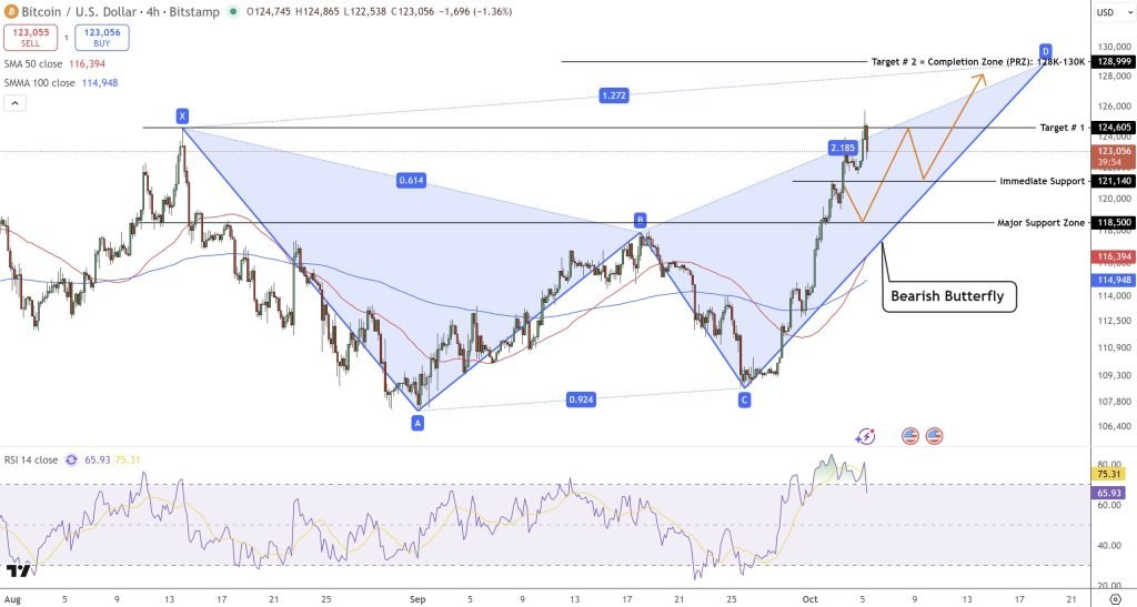 As mentioned in my Bitcoin price prediction, BTC’s recent rally has unfolded exactly as projected. The cryptocurrency broke above the $118,000 resistance, maintained bullish momentum within the Bearish Butterfly pattern, and touched $124,600 before entering a consolidation phase.