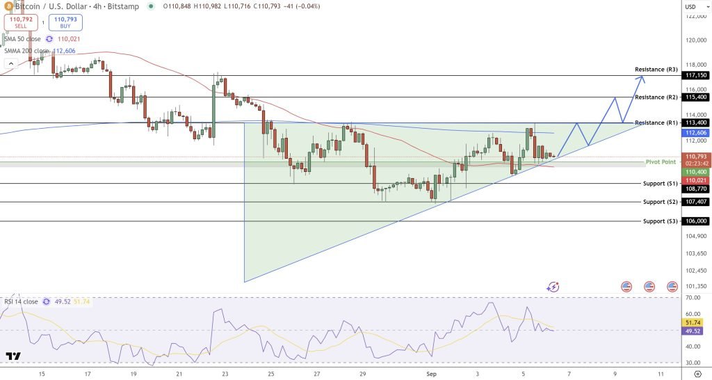 The 50-SMA at $110,021 is supporting price action, and the 200-SMA at $112,606 is the pivot. RSI is at 50, showing consolidation with mild bullish divergence; momentum is stabilizing.