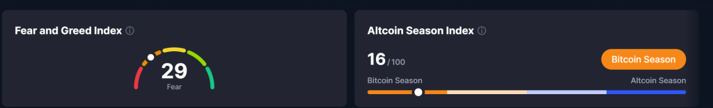 Market psychology remains guarded. The Fear and Greed Index sits at 29, firmly in fear territory, reflecting cautious positioning rather than optimism. Meanwhile, the Altcoin Season Index at 16/100 confirms capital concentration in Bitcoin, with little appetite for broad risk rotation.