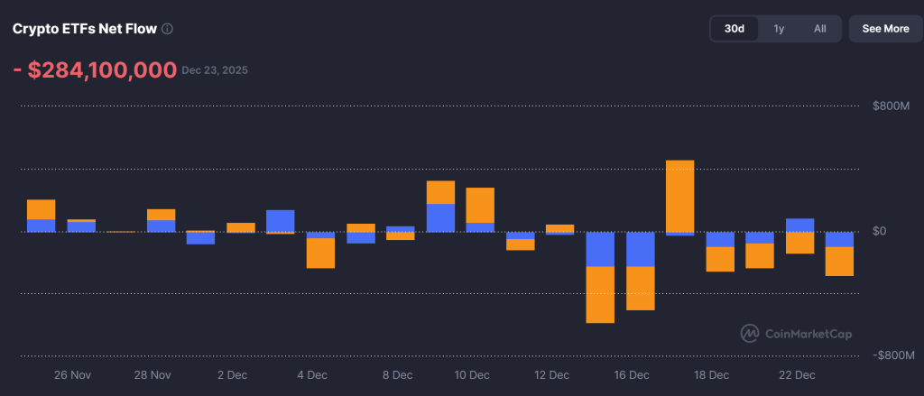 Institutional flows remain a near-term headwind. Crypto ETFs recorded net outflows of $284.1 mn on December 23, reinforcing a short-term risk-off bias among larger allocators. Notably, these outflows have weighed on momentum without triggering disorderly selling, implying portfolio rebalancing rather than outright exits.