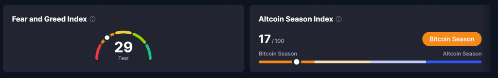 Market-wide indicators reinforce the cautious tone. The Crypto Fear and Greed Index sits at 29, firmly in “fear” territory, while the Altcoin Season Index reads just 17, underscoring a decisive rotation back into Bitcoin dominance.