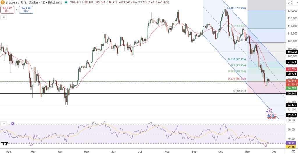 A stronger trend shift requires a break above $90,798 (0.382 Fib). That would lift BTC above the channel’s midline and the 20-EMA, opening upside targets at $93,966 and $97,135. A clean breakout above $97,000 would signal the first meaningful recovery since October.