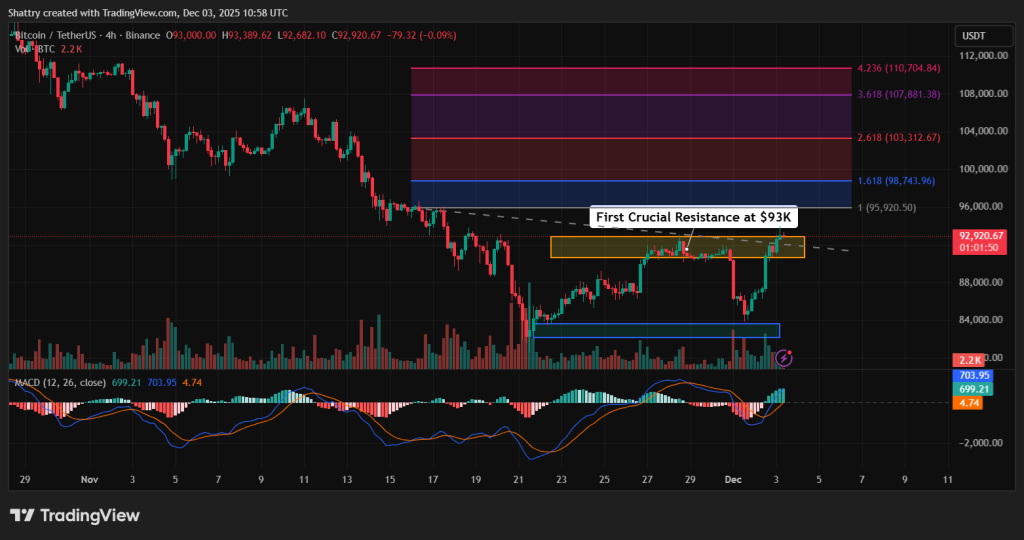 A decisive close above $93,000 would open the path toward $98,700, with larger Fibonacci targets at $103,000, $107,000, and eventually $110,000 if momentum accelerates.