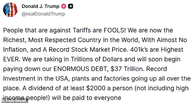 Trump defended his tariff policy, calling critics “fools,” and said the plan would exclude “high-income people,” though he didn’t specify income thresholds.