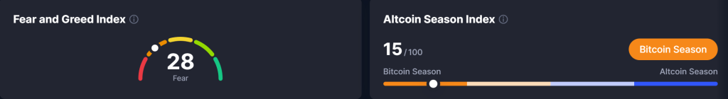 The market is on edge. The crypto fear & greed index is stuck in fear, and we’ve just seen a $99.9 million net outflow in recent ETF flow data, which only adds to short-term risk aversion.