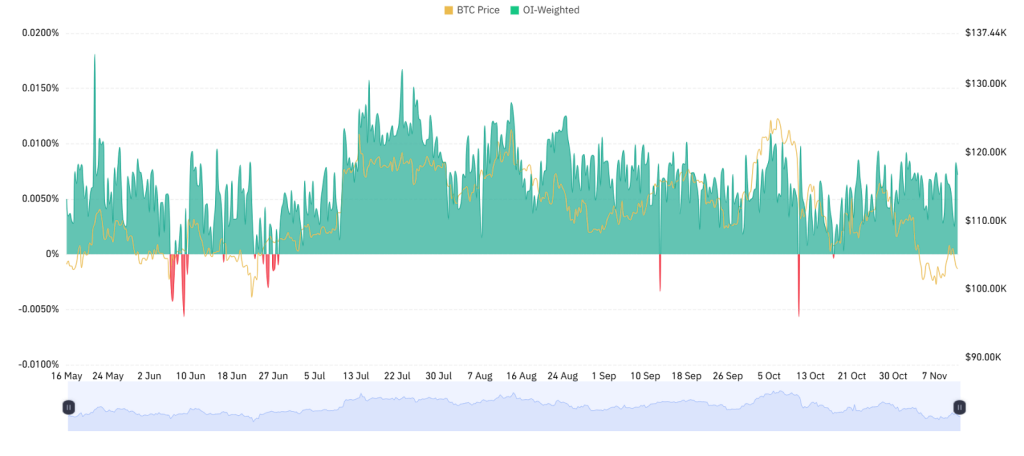 Latest data on Bitcoin derivatives indicate a cooling phase in the market, as funding rates and volatility constrict. The chart presents Bitcoin’s price (yellow), along with open interest (OI) weighted funding rates (green and red), to illustrate shifts among traders.