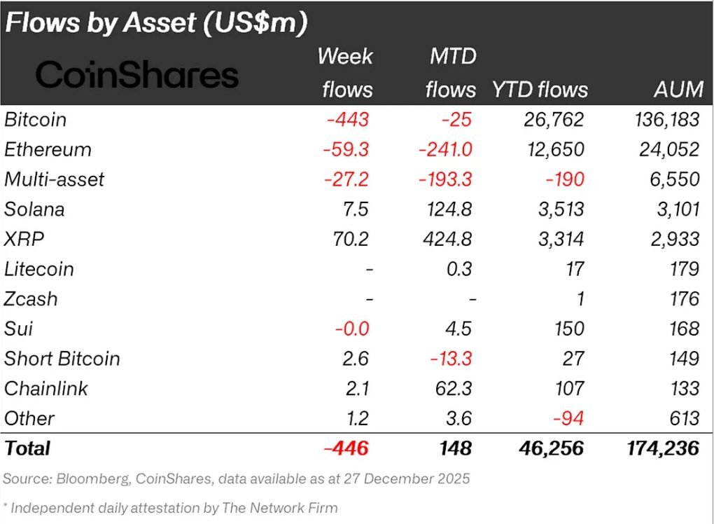 ETF flows line up with the price action, as a CoinShares report noted that digital asset products saw $446 million in outflows in the week to December 29, with Bitcoin products losing $443 million and total post‑October 10 outflows hitting $3.2 billion.