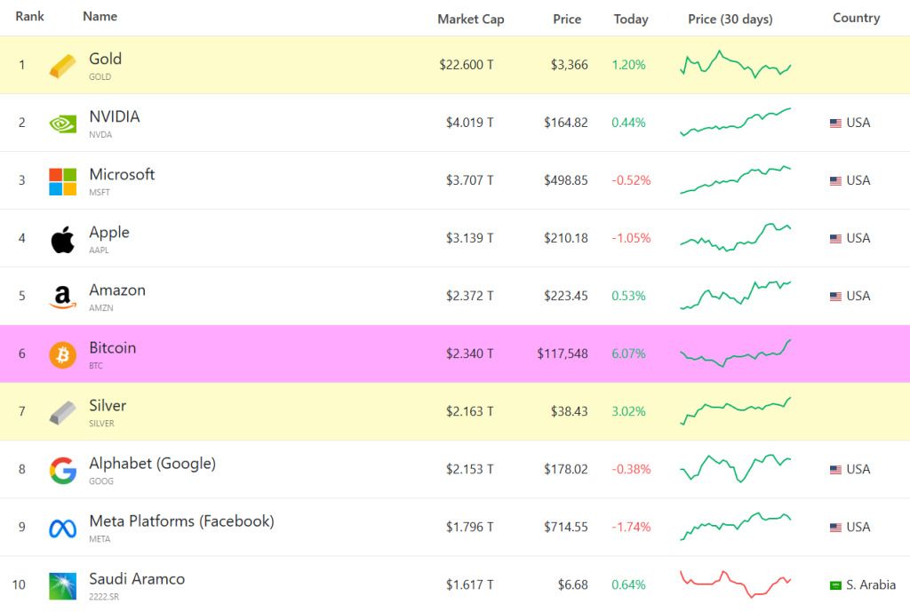 Tech giants Google and Meta are behind BTC and silver, with $1.15 trillion and $1.79 trillion, respectively.