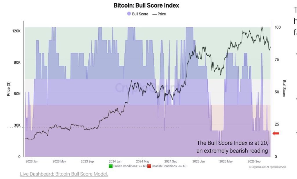 CryptoQuant’s Bull Score Index reflects the extent of the downturn. Earlier in October, when Bitcoin reached its all-time high of $126,000, the index stood at a strongly optimistic reading of 80. That optimism evaporated quickly as Bitcoin slipped below $100,000 for the first time since June.
