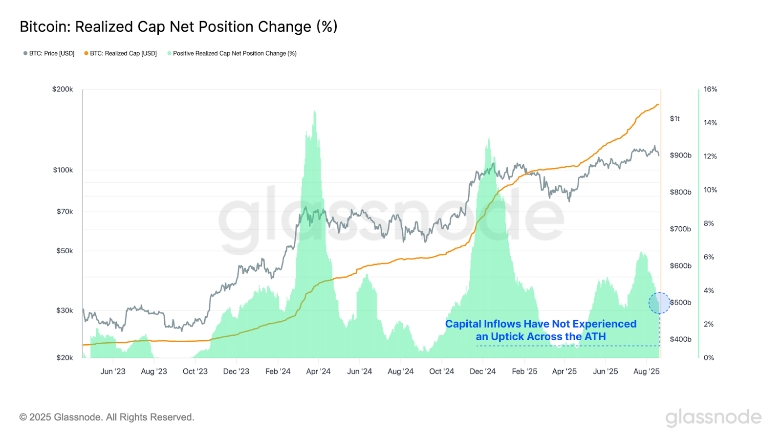 Capital inflows into Bitcoin have notably weakened despite the formation of a new all-time high at $124,400, with realized cap increases reaching only 6% monthly compared to 13% during the initial $100,000 breakout in late 2024.