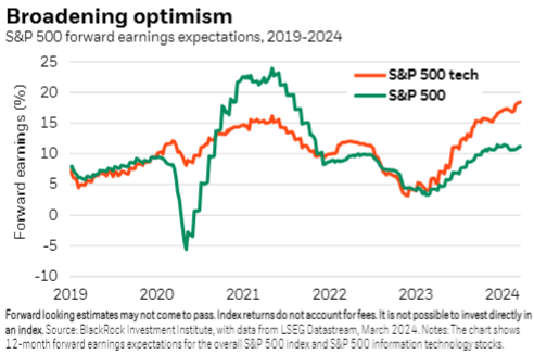 “As Q2 kicks off, we still see a more supportive near-term backdrop for risk-taking. U.S. inflation has eased from its pandemic highs and growth has held up. And expectations for S&P 500 earnings growth for 2024 have been revised up to about 11%,” BlackRock stated in a weekly market commentary report.