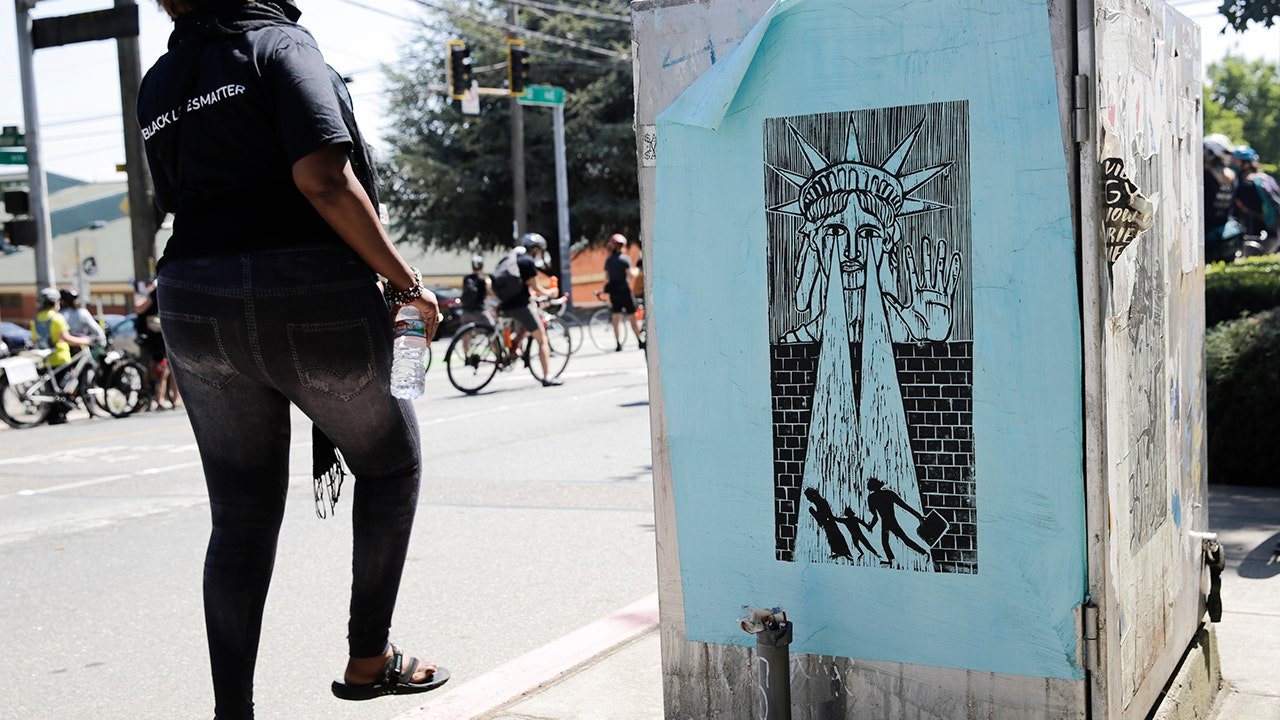 A woman walks by a street poster depicting Lady Liberty preventing an immigrant family from crossing the wall, during a “Defund the Police” march from King County Youth Jail to City Hall in Seattle, Washington on August 5, 2020.  ((Photo by JASON REDMOND/AFP via Getty Images))