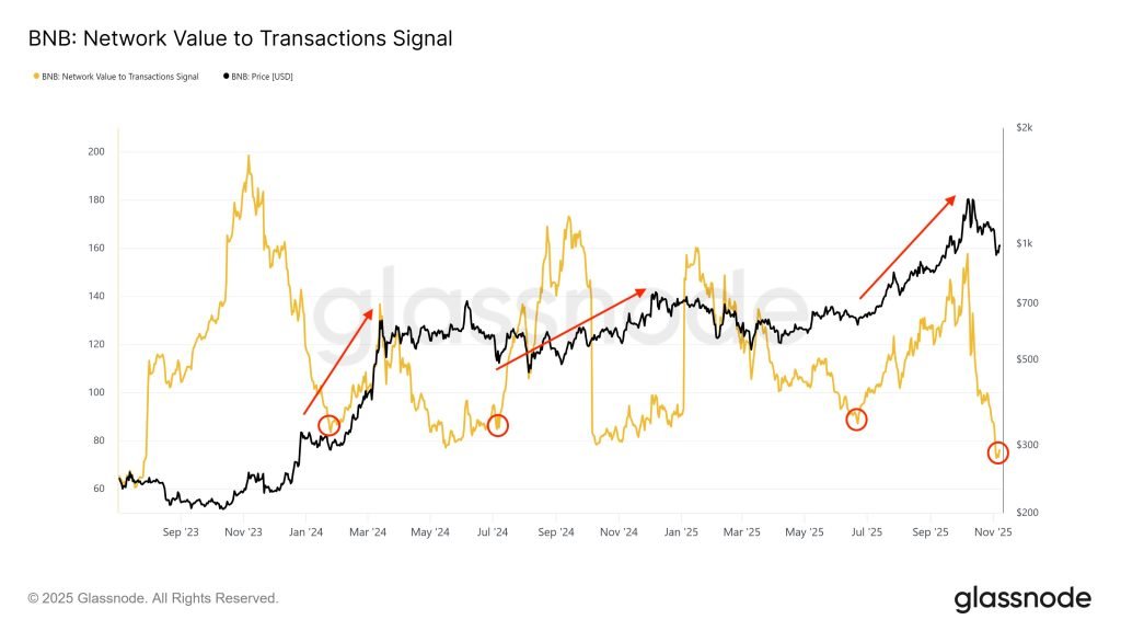 The last time the NVT metric hit a low of around 90, BNB started its ascent from $650 to its all-time high of $1,300.