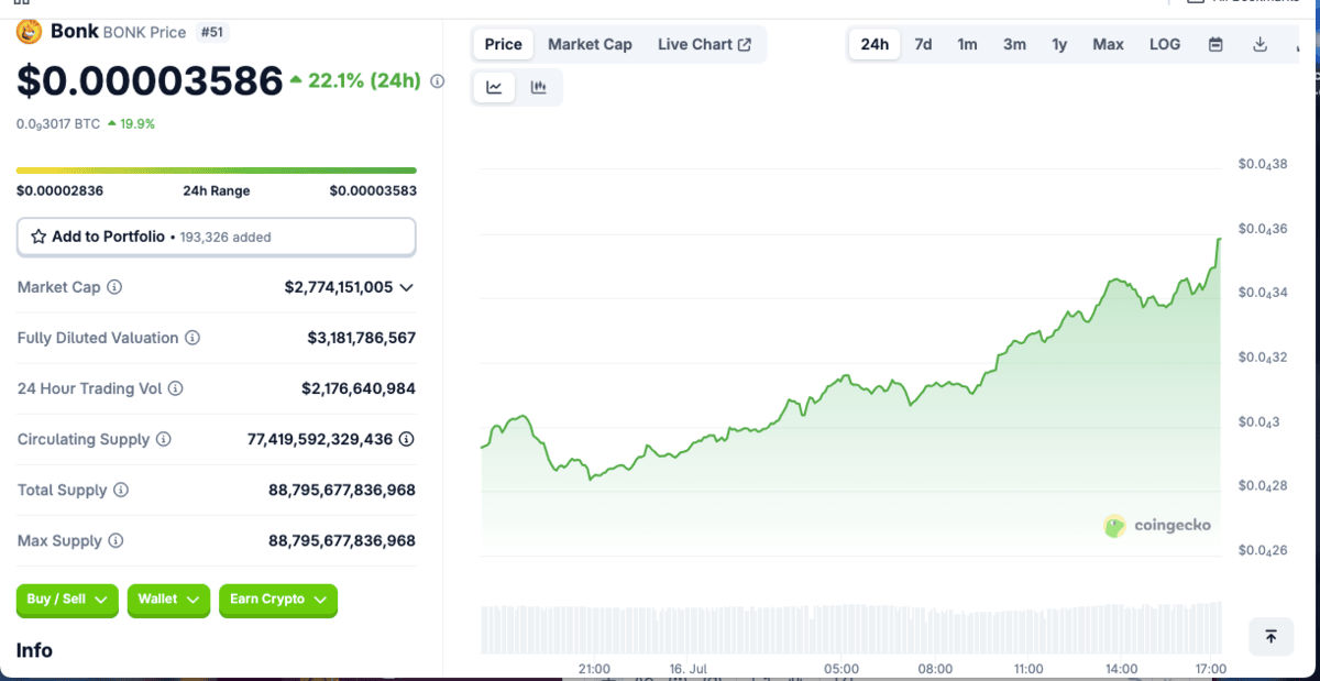 Bonk ($BONK) has increased by 22.1% in the past 24 hours and is trading at $0.00003508, as traders piled back into the Solana meme token amid renewed volatility. This marked an 81.1% increase over the last seven days, indicating a sharp reversal from the depths of early July and a resurgent bullish sentiment.