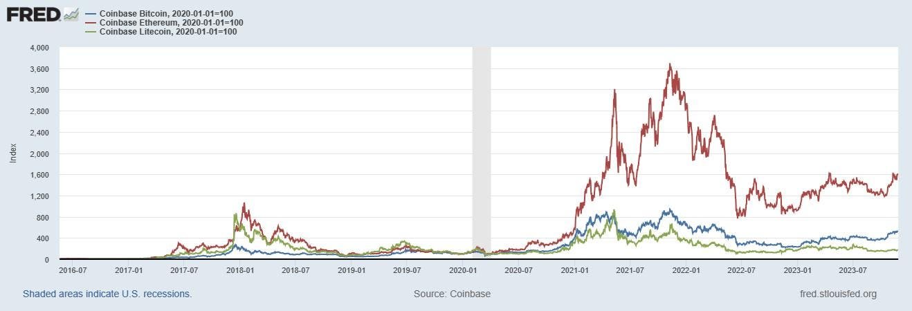 Indexed changes in value of cryptocurrencies Bitcoin, Ethereum, and Litecoin.