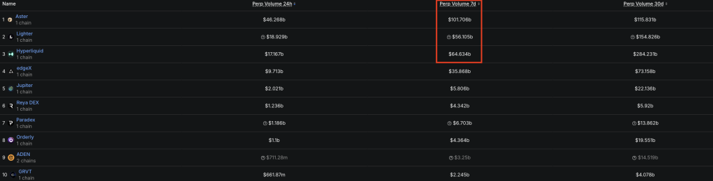 This could be the exchange’s way of stepping into the perp DEX market to prevent Hyperliquid from taking too much of its client base. And so far, the numbers suggest it is working. According to DeFiLlama, Aster’s trading volume over the past seven days topped $100 billion. Lighter followed with $56 billion, while Hyperliquid ranked third with $64.6 billion (note: it takes third place in the table due to lower daily volume).
