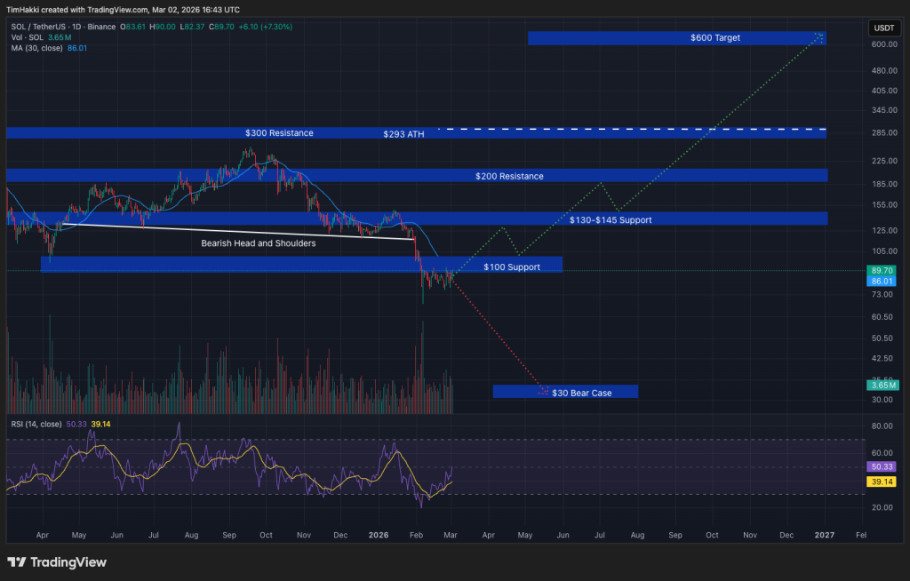 Even so, SOL suffered a deep correction in late 2025 and spent much of February trading below the $100 level.