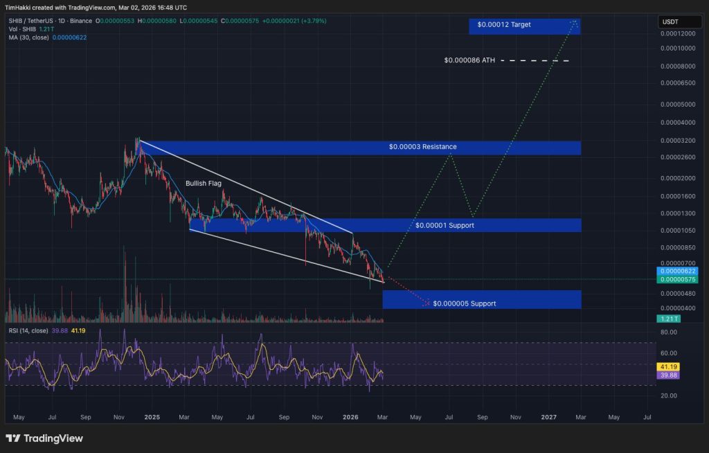 At its current price near $0.0000057, ChatGPT’s analysis indicates that a decisive breakout above the $0.000025–$0.00003 resistance zone could ignite strong bullish momentum, potentially driving SHIB toward $0.00012 before year-end.